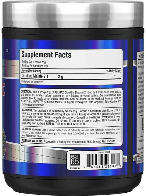 تناول مكيالًا واحدًا (2 جم) من مالات السيترولين [1:2] من ALLMAX حتى 3 مرات يوميًا، عند الاستيقاظ وقبل التمرين أو أي نشاط بدني مكثف بحوالي 45 دقيقة. وفي الأيام التي لا تتمرن فيها، تناوله قبل الوجبات على معدة فارغة. كما يمكن إضافته إلى تركيبات ما قبل التمرين مثل ACUTS™ وIMPACT™. مالات السيترولين يتآزر بشدة مع مكملات الأرجينين وبيتا ألانين والكرياتين.
