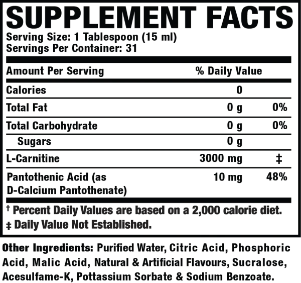 السائل l-كارنيتين 3,000 ملغم  نسبة قوية لكل حصة مع 31 حصص لكل زجاجة. جرب لقطة لذيذة من الكارنيتين كجزء من نظام صحتك واللياقة البدنية اليومي.