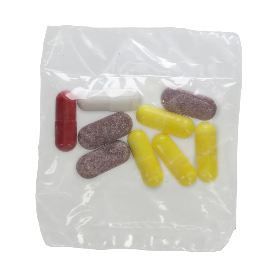 ثاني فوسفات الكالسيوم, جيلاتين (بقري), مالتوديكسترين, سليولوز دقيق التبلور, ستيرات المغنيسيوم, حمض الستياريك, ثاني أكسيد التيتانيوم, لون أحمر رقم 40 مصرح باستخدامه في الأغذية، والأدوية، ومستحضرات التجميل, لون أصفر رقم 5 مصرح باستخدامه في الأغذية، والأدوية، ومستحضرات التجميل, لون أزرق رقم 1 مصرح باستخدامه في الأغذية والأدوية ومستحضرات التجميل, ومغلف بطبقة مصنفة دوائيًا.