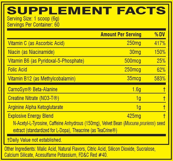 هذا المنتج مخصص للبالغين الأصحاء فقط من سن 18 عامًا فما فوق. لا يستخدم أثناء الحمل أو الإرضاع أو في حالة تناول مثبطات الأنزيم فسفودايستراز-5 أو نترات لعلاج ألم الصدر. قم باستشارة مختص رعاية صحية مؤهل ومرخص قبل تناول هذا المنتج، خاصةً في حالة تناولك مكملات غذائية أو أدوية بوصفة طبية أو أدوية دون وصفة طبية أخرى، أو في حال راودك شك بأنك تعاني من مشكلة صحية أو أي شخص من عائلتك تم تشخيصه بحالة مرضية، أو له تاريخ مرضي. يحتوي هذا المنتج على مادة الكافيين ويجب عدم استخدامه بالمزج مع الكافيين أو المنشطات من مصادر أخرى. توقف عن استخدام المنتج واتصل بطبيبك إذا تعرضت لأي آثار عكسية من هذا المنتج. لا تستخدم هذا المننتج باستمرار لأكثر من 8 أسابيع. لا تستخدمه إذا كان غلاف الأمان ممزقًا أو مفقودًا. يحفظ في مكان بارد وجاف. يحفظ بعيدًا عن متناول الأطفال. يُباع هذا المنتج بالوزن وليس بالحجم. قد يحدث بعض الترسب للمسحوق أثناء الشحن والتسليم، مما قد يؤثر على كثافة المسحوق. يحتوي هذا المنتج على الجرعات المشار إليها عندما تم قياسها بالضبط حسب الوزن.