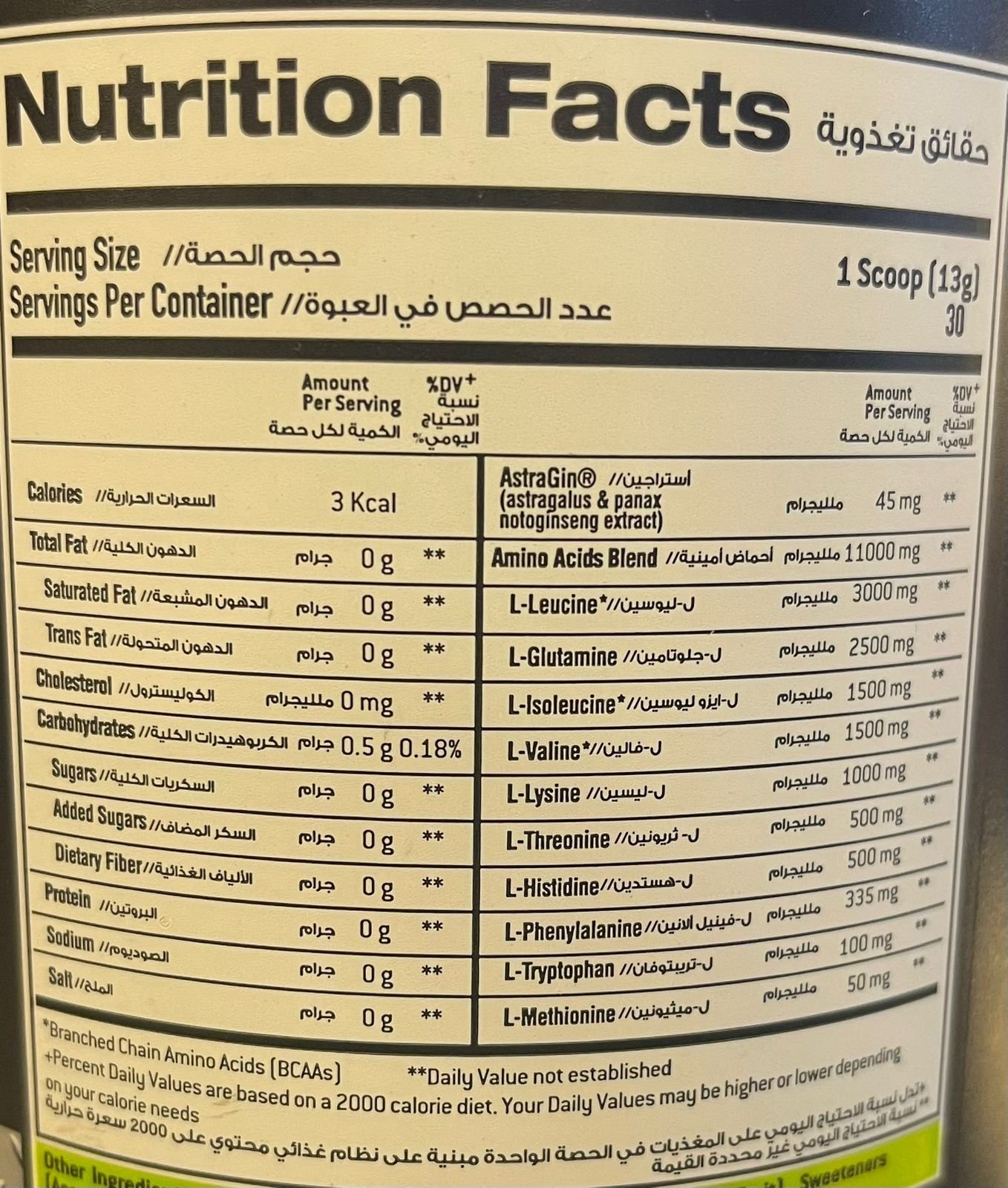 390 جرام حلوى الفاكهة حجم الحصة 1 Scoop 13 g حصص لكل علبة: 30 القيمة لكل حصة سعرات حراريه 3 Amount Per Serving DV% Total Fat 0 mg * Saturated Fat 0 mg * Trans Fat 0 mg * Cholesterol 0 mg * Carbohydrates 0.5 g 10.18% Sugars 0 mg * Added Sugars 0 mg * Dietary Fiber 0 mg * Protein 0 mg * Sodium 0 mg * Salt 0 mg * AstraGinⓇ// (astragalus & panax notoginseng extract) 45 mg * Amino Acids Blend 11000 mg * L-Leucine 3000 mg * L-Glutamine 2500 mg * L-Iso leucine 1500 mg * L-Valine 1500 mg * L-Lysine 1000 mg * L-Threonine 500 mg * L-Histidine 500 mg * L-Phenylalanine 335 mg * L-Tryptophan 100 mg * L-Methionine 50 mg * *Daily Value not established +Percent Daily Values are based on a 2000-calorie diet, Your Daily Values may be higher or lower depending on your calorie needs المكوناتAcidulant (Citric Acid), Natural Flavour (Candy Fruit), Sweeteners (Acesulfame K, Sucralose), Natural Colouring (Beetroot Red).