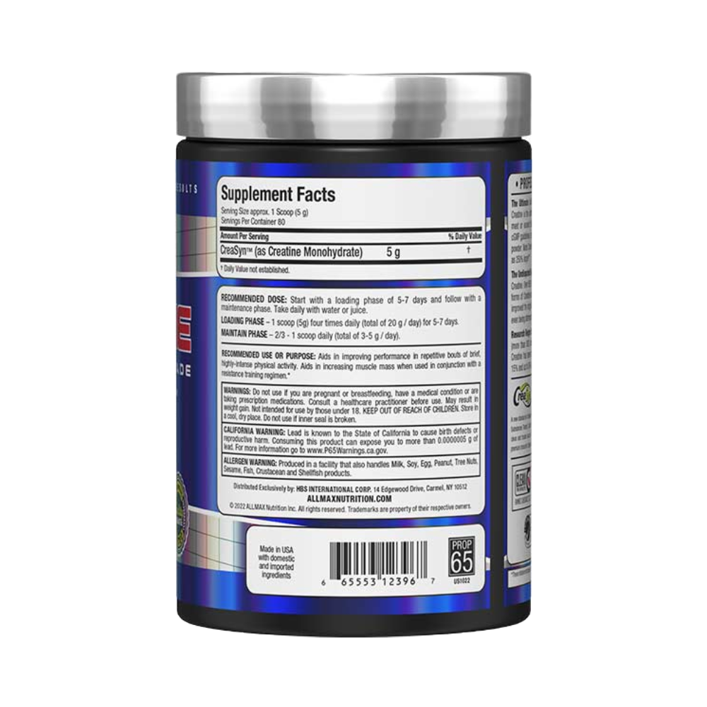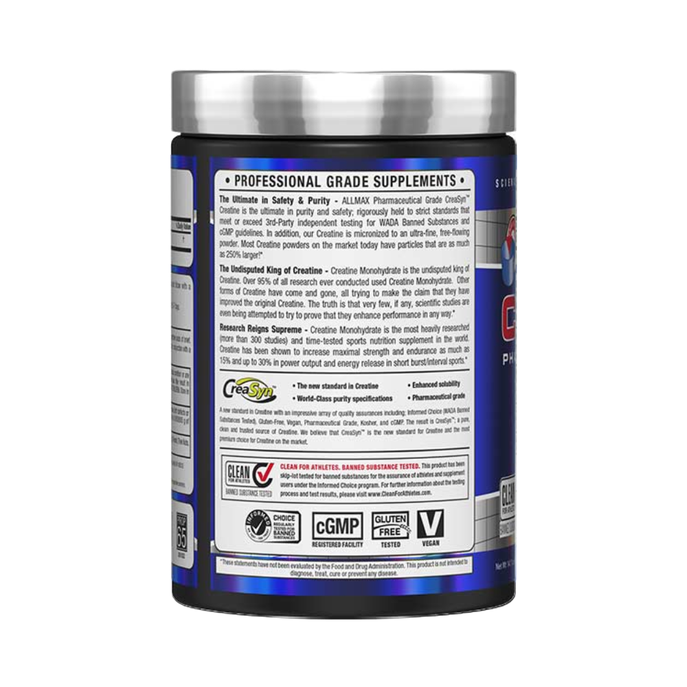 أقصى درجات السلامة والنقاء – إن كرياتين CreaSyn™ المُصنف دوائيًا من ALLMAX هو المنتج المثالي من حيث النقاء والسلامة؛ نحن نلتزم التزامًا صارمًا بالمعايير الدقيقة التي تلبي بل وقد تتفوق على الاختبارات المستقلة التابعة لجهة خارجية بشأن المواد المحظورة من الوكالة العالمية لمكافحة المنشطات (WADA) وإرشادات أحدث أساليب جودة التصنيع. بالإضافة إلى ذلك، فإن الكرياتين الذي ننتجه دقيق الجزيئات ليصبح فيما بعد مسحوق دقيق شديد النعومة. تحتوي معظم مساحيق الكرياتين الموجودة في السوق حاليًا على جزيئات أكبر حجمًا بنسبة تصل إلى 250%!