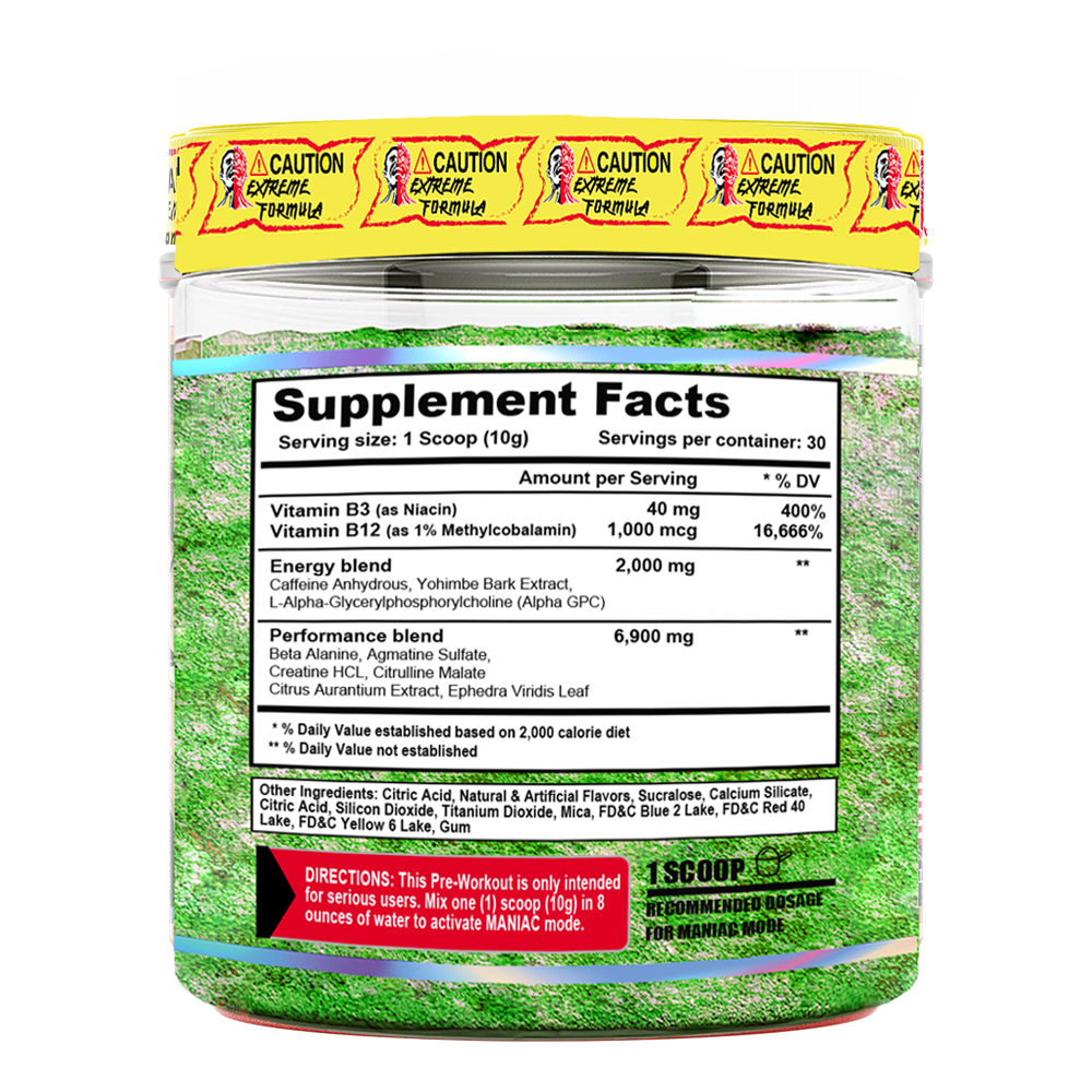 MANIAC combines caffeine, beta-alanine, citrulline malate, and nootropic compounds to increase blood flow, mental focus, and training intensity. The result: more reps, better pumps, and unmatched energy levels during your entire workout.